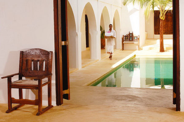 Jahazi House, named after the historical large trading dhows that brought Lamu its trading wealth, stands right on the edge of the Indian Ocean on two acres of garden. From the first floor makuti-covered veranda you can watch the dhows come and go, collecting sand and delivering coral blocks and fish. The house is built of coral block plastered in the local neru finish, tinted a soft ochre yellow. The house has been designed along traditional lines around an inner courtyard, which holds a very private swimming pool, cooling the public rooms and bedrooms.