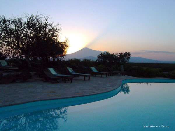 The lodge's swimming pool and sundeck is spectacularly located on top of a hill affording a breathtaking 360° panoramic view of mount Kilimanjaro, Mount Meru, the Maasai steppe and onwards. Close by is Arusha National Park.