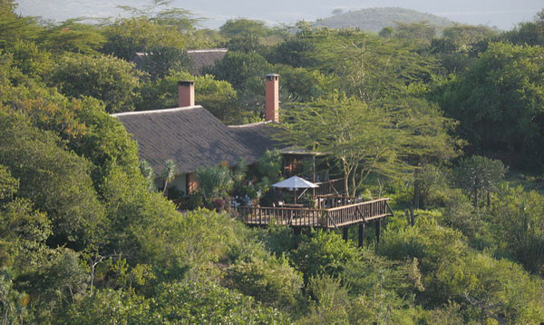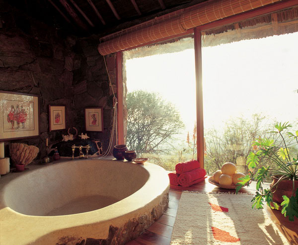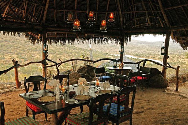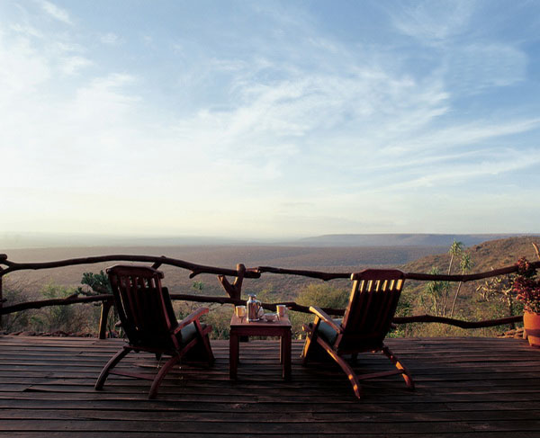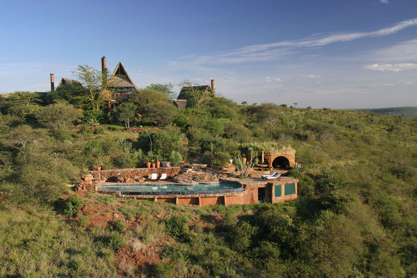 The Lodge stands high on the edge of a plateau with long views south towards the glittering spires of Mount Kenya. It was constructed from local stone, cedar and palm thatch; and features seven rooms each with cantilevered decks soaring off the edge of the natural escarpment. A thousand feet below, verdant water-hole acts as a potent draw for the abundant wildlife with which this unique wilderness teems.