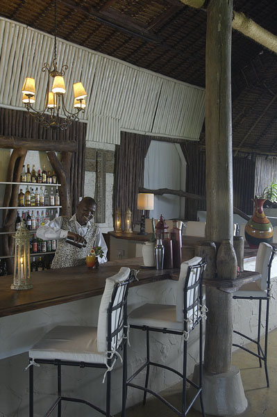The camp offers a central dining room and a sunken bar with open fireplace.