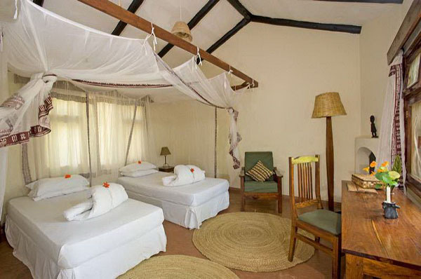 Accommodation at Moivaro Lodge is provided in pretty thatched garden cottages, each with its own veranda overlooking the gardens, There are 40 double (or triple) rooms and 2 single rooms. Each cottage has a large bedroom plus a neat lounge with fireplace and desk. The en-suite bathrooms offer bath and separate shower. All rooms offer room service and have mosquito nets and ceiling fans.