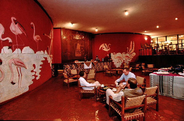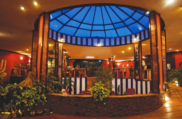 The Ngorongoro Sopa Lodge features a central glass atrium, while the central lounge presents hand-painted murals of local wildlife.