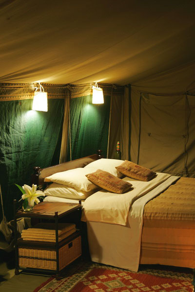 The double beds are generously sized, flanked by wicker bedside tables, and covered in Indian-elephant bedspread. In one corner lies an open clothes wardrobe, while in the other a writing table. The bathroom with a bucket shower, flush loo, wash stand and a stool is linked to the main tent which can be separated by a canvas curtain for extra privacy.