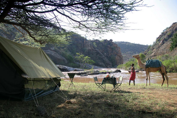 Sabuk Lodge is a stunning wilderness destination, perched on the high banks of the Ewaso Nyiro River in the Northern Frontier District, overlooking the Laikipia Plateau and Samburu land. The lodge has 5 beautifully furnished open sided en-suite cottages with verandas, each with its own fabulous view. Sabuk was fashioned out of the local landscape, built with local materials, twisted wood and stone boulders incorporated into the architecture. Open walls and private veranda's face out over the river gorge 150 feet below. Sabuk Fly camp is perfect for clients spending 3 or more days. Walk with a professional safari guide, a team of trained Laikipiak Maasai warriors and camel train through completely deserted tracts of wilderness: no other tourists, no roads or vehicles, only wildlife and their tracks, breathtaking scenery, the sounds of the bush, just Africa.