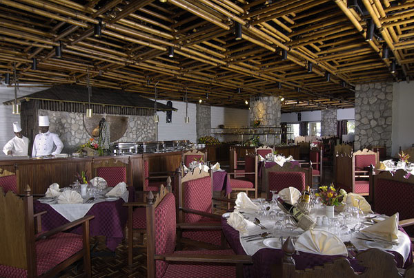 The Main restaurant serving buffet breakfast, lunch and dinner with live cooking counters preparing specialty dishes. Cuisine includes Pan-African, Pan-European and Pan-Asian. The lodge also offers the lobby bar. Champagne breakfasts can be served in the bush and bush dinners are offered at Kudu Point, the highest point within the sanctuary.