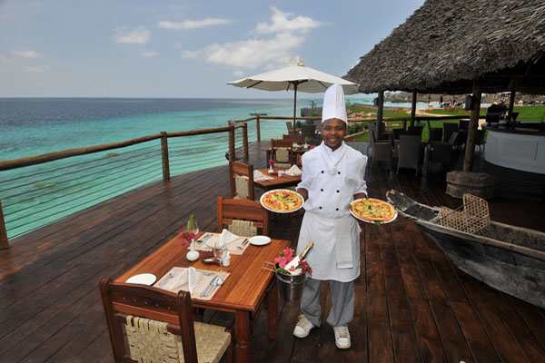 Dining and bars The hotel offers a range of restaurant experiences, specializing in global cuisine with particular emphasis on freshly-caught sea food. Choices include: ‘The Spices' outdoor restaurant, ‘Samaki', specialist sea-food restaurant, ‘Coco', a cliff-top restaurant offering light lunches, pizza, grills and high tea. Additionally there is the ‘Upepo' swim-up bar, the ‘Baraza' two-storey beach bar, and the ‘Hunters Grill', poolside al fresco BBQ area. Evening entertainment includes live bands, disco, cultural dance and cabaret.