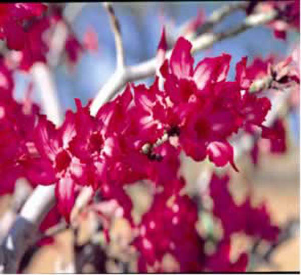 The reserve is characterized by large tracts of Commiphora-dominated bushland, open areas of lava rock with scattered grass and shrubs and alkaline grasslands dotted with springs and swamps. There is also extensive Acacia tortilis woodland, and a narrow band of riverine forest with magnificent Acacia elatior , Tana River Poplar (Populus ilicifolia ) and Doum Palm (Hyphaene compressa ) along the Ewaso Ng'iro River. The uniform khaki of the shrub is also enlivened by the occasional bulbous trunk and brilliant pink bloom of the indigenous succulent known as the ‘Desert Rose' (Adenium obesum ) while the Salvadora persica (tooth-brush tree) shrub is a favourite both with browsing elephants, and with the nomadic Samburu people, who break off twigs to use as toothbrushes.