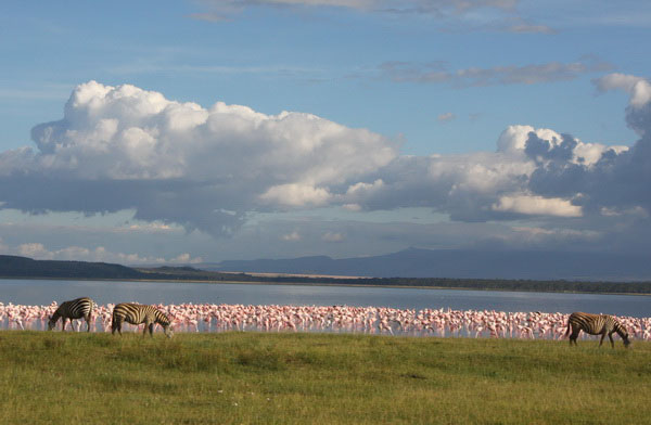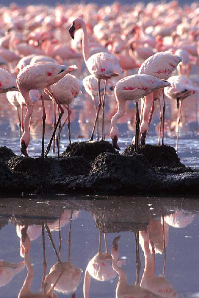 The only constant alkaline habitat in the Rift Valley, Lake Bogoria provides a major feeding site for its itinerant population of an estimated two million lesser flamingoes, which increasingly since the 1990's tend to frequent Bogoria's waters rather than the more polluted waters of Lake Nakuru. Promenading the shoreline in shifting lines of mature pink and immature white, they can be seen scything their beaks to and fro to sift algae from the water. Some stand on one leg, others chug through the water like ducks or upend and kick their shocking pink legs in the air; all murmur, honk and mutter in incessant dialogue, and overhead cyclamen and black flight formations arrow in, tiptoeing briefly on the water before fluttering to an elegant landing.