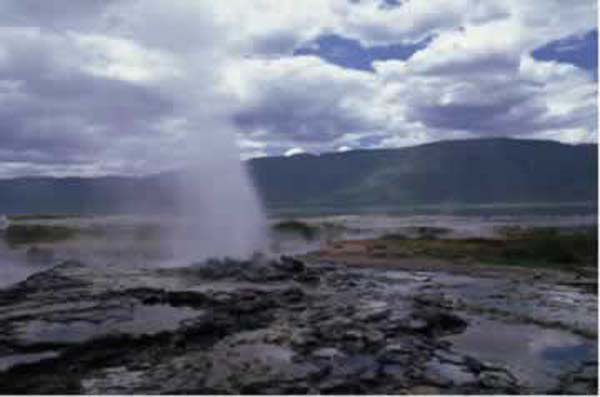 Bogoria has around 200 hot springs in total but the largest and most spectacular collection erupts along the lakeside at Loburu, some 9 km from Loboi Gate. Characteristically signs of declining volcanic activity, hot springs are an indication that molten rock (magma) lies not far below the earth's surface. Boiling up from beneath the precariously shallow crust of the earth at temperatures from 94 - 104 Degrees Celcius, the diamond-clear water is scalding hot to the touch and wreathed in billows of steam. Bursting into bubbling pools and boiling waterfalls, many of the ochre-brown depressions centre on sulphurous rock sculptures from which angry geysers blow jets of boiling water several meters into the air. Surreally set against the pink of the flamingoes, the petrol-blue of the lake and the forbidding mass of the escarpment, and punctuated by the bizarre spectacle of visitors boiling eggs in the writhing waters, the scene resembles a vision from an insanely beautiful hell.
